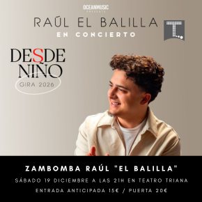 El evento se realiza en el Teatro Triana (C/ Condes de Bustillo, 17)Raúl El Balilla se dio a conocer con solo 8 años en la primera edición de «La Voz Kids», donde cautivó al público con su interpretación de «Como el agua» de Camarón de la Isla. A sus 21 años, Raúl ya cuenta con más de 5 discos y más de 380 conciertos en Europa y América. Premiado como la voz más joven del flamenco, sigue revolucionando la música con su estilo único y proyección internacional. En esta ocasión viene al Tetro Triana con un espectáculo de Zambomba que no os dejará indiferentes esta Navidad.