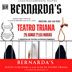 La Escuela Social de Teatro Acontracorriente presenta Bernarda’s, una versión libre inspirada en La casa de Bernarda Alba de Federico García Lorca, resultado del trabajo del Taller de Teatro Avanzado de la escuela. El montaje propone una mirada contemporánea sobre el universo lorquiano: un espacio simbólico donde el poder, el silencio, la represión y el deseo se enfrentan en un clima de intensa tensión dramática. A través de una puesta en escena estilizada y visualmente potente, las intérpretes exploran el conflicto entre la tradición y la libertad, dando voz a mujeres atrapadas entre las normas sociales y sus propios anhelos. Bernarda’s es el fruto de meses de investigación escénica y trabajo colectivo dentro del proceso pedagógico de Acontracorriente Teatro, donde el alumnado desarrolla herramientas de interpretación, creación y presencia escénica en un contexto de montaje real ante el público.